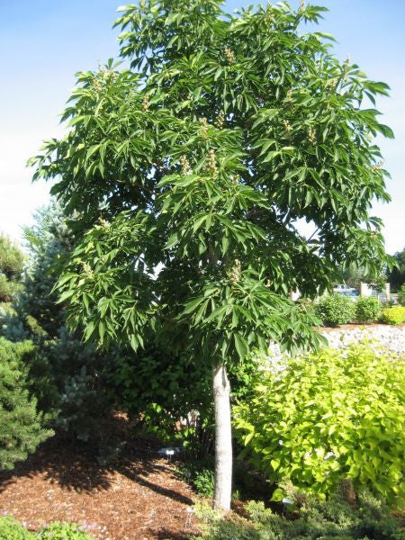 DESCRIPTION: Small, rounded tree with fragrant, upright cone-shaped clusters of white-yellow orchid-like blooms in late spring. Palm-shaped yellow to red fall foliage and large brown seed capsules. Seed poisonous if ingested. Tolerates wide range of soil conditions.