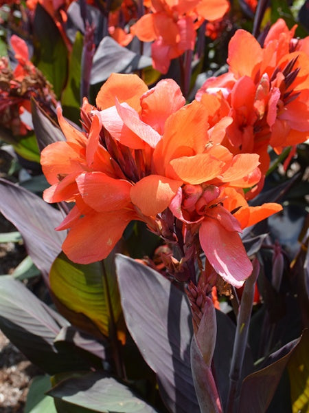 DESCRIPTION: A tropical look in the garden with huge copper-burgundy leaves; large flowers that are a stunning orange, on top of this medium height variety; perfect for borders or as an accent