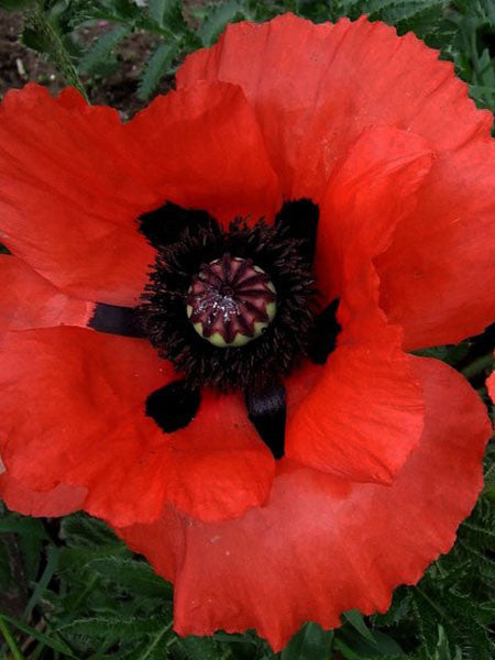 DESCRIPTION: Brilliant Poppy features bold scarlet round flowers with burgundy eyes and black centers at the ends of the stems from early to mid summer. The flowers are excellent for cutting. Its deeply cut ferny leaves remain forest green in colour throughout the season.