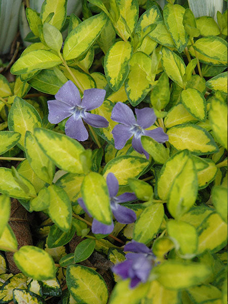 DESCRIPTION: A breathtakingly colorful evergreen groundcover featuring rich lavender flowers held over very glossy yellow-variegated foliage that colors the whole garden; does well in sun or deep shade, quickly forms a dense mat, even grows well under trees