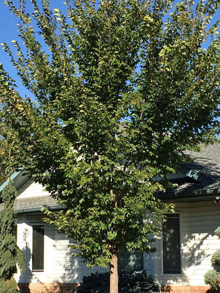 DESCRIPTION: Cultivar of American Elm with a more compact, vase-shaped canopy. Nice dark green, serrated pointy leaves turn golden in fall. Tolerates both dry and wet conditions